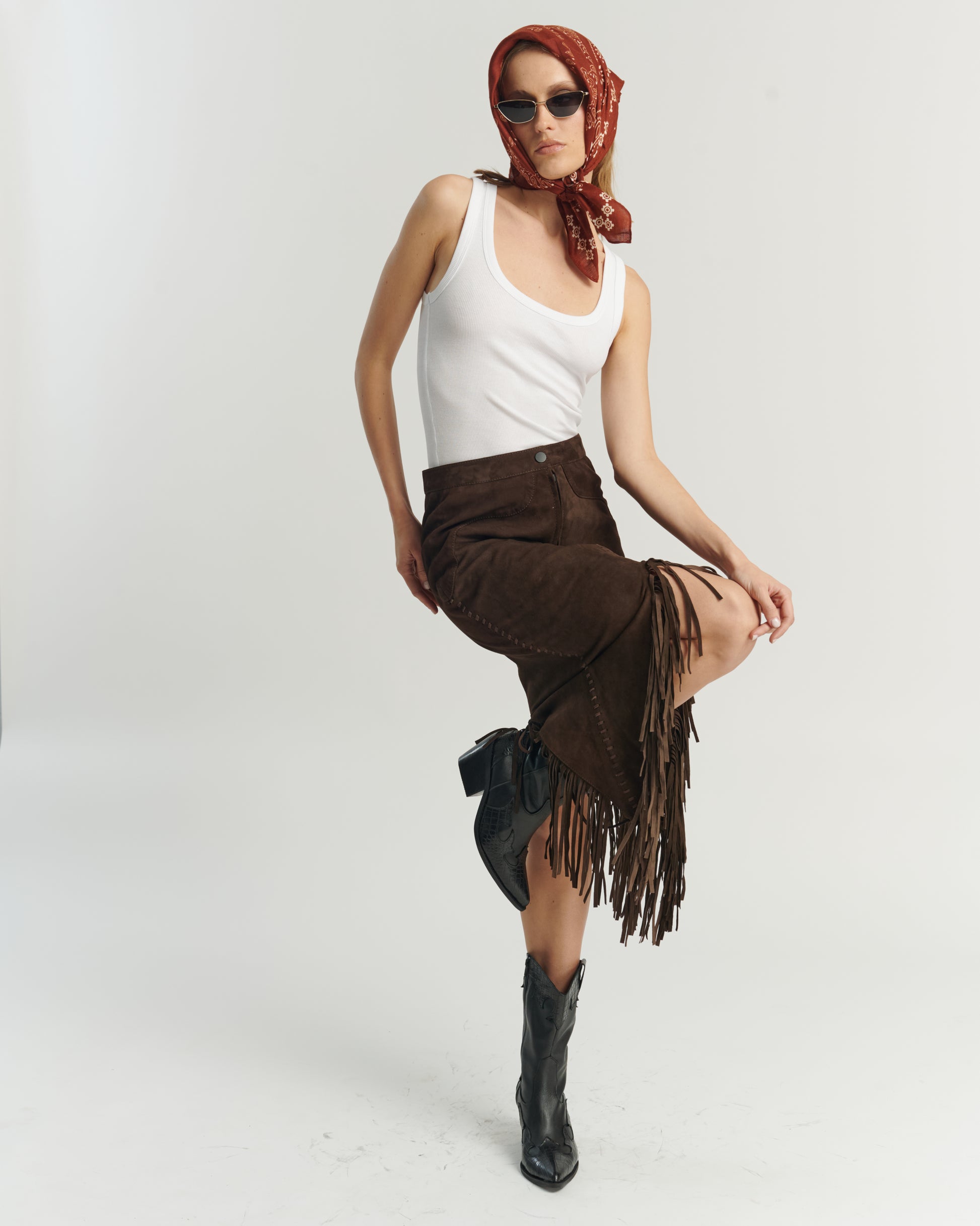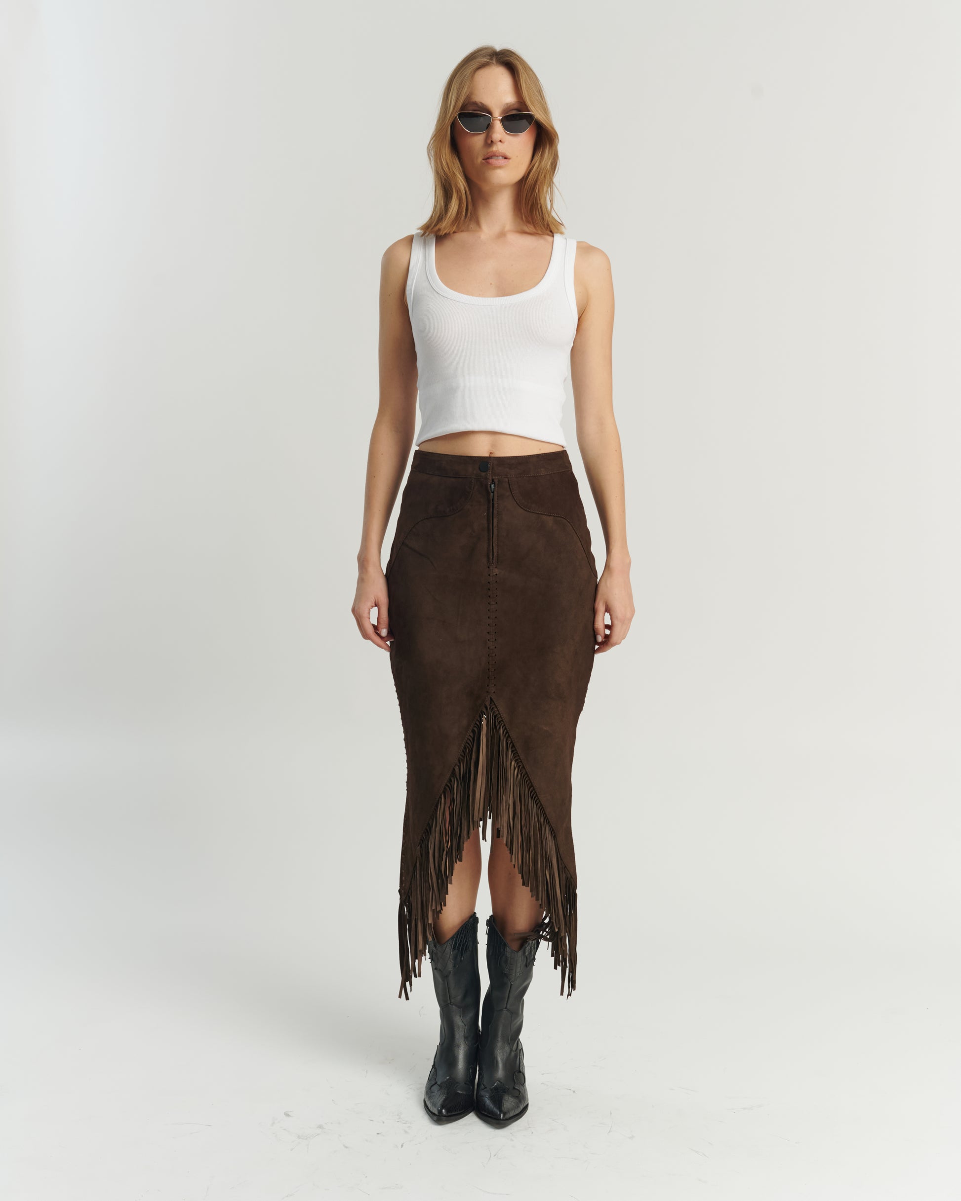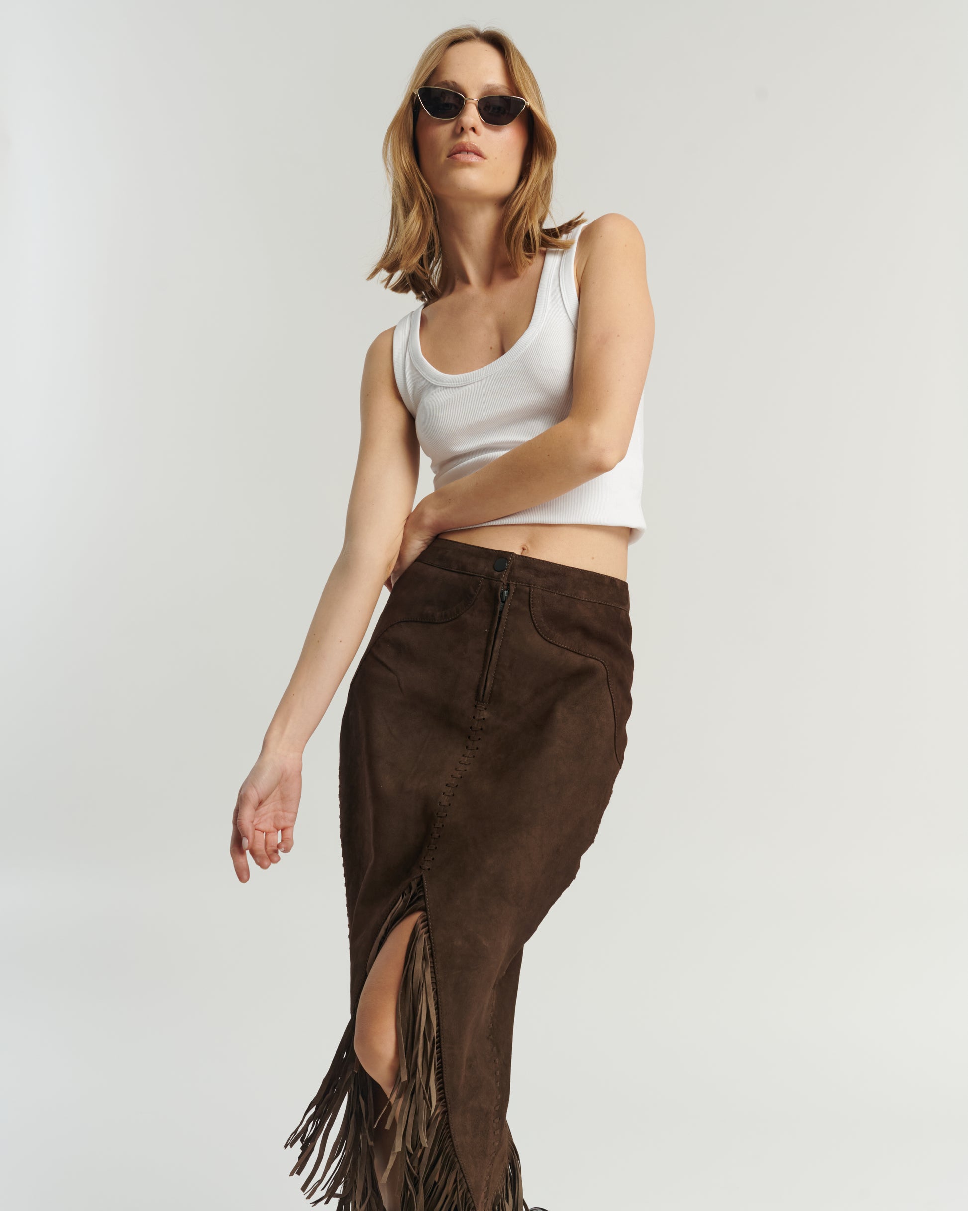Falda con flecos, 100% cuero, color chocolate.