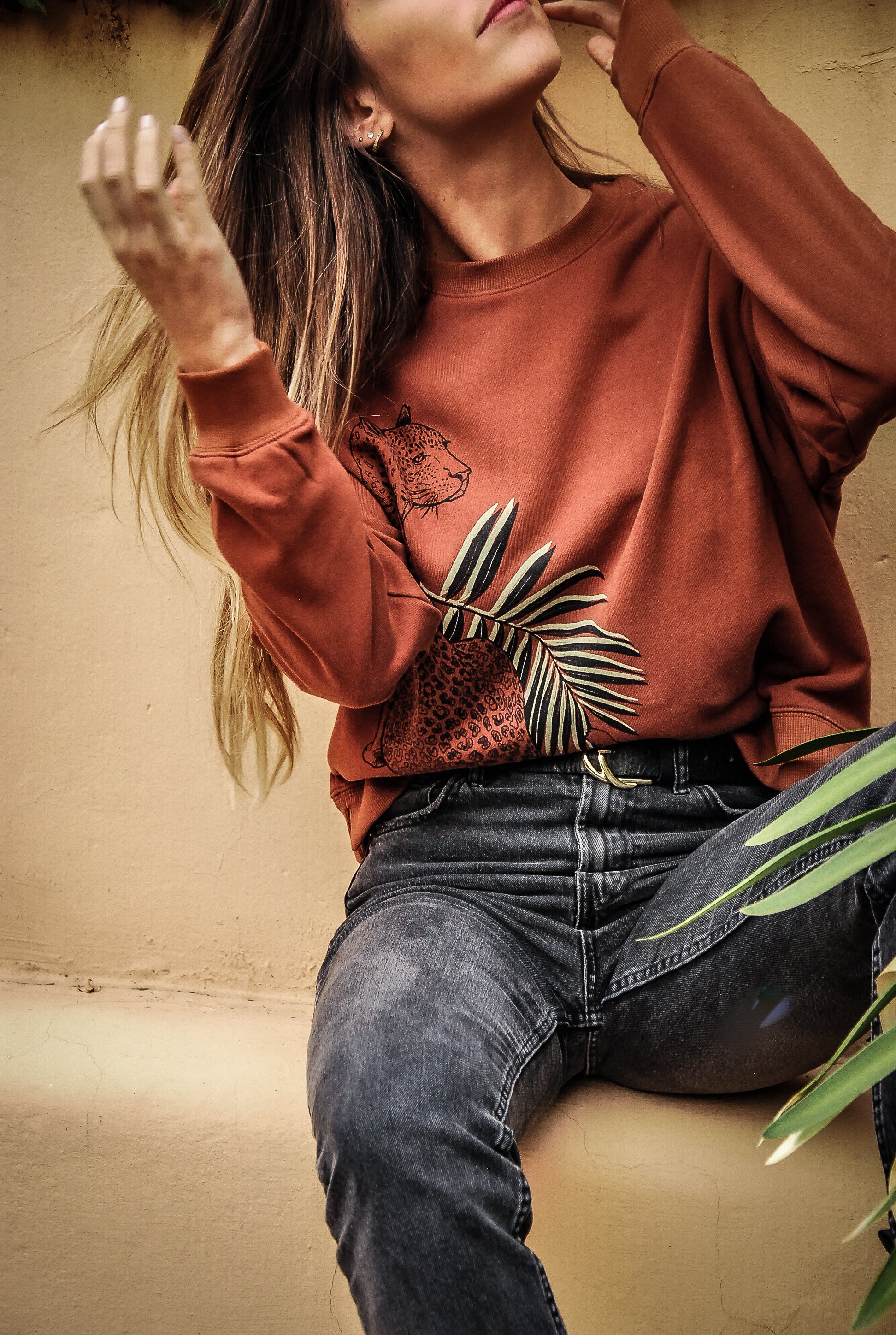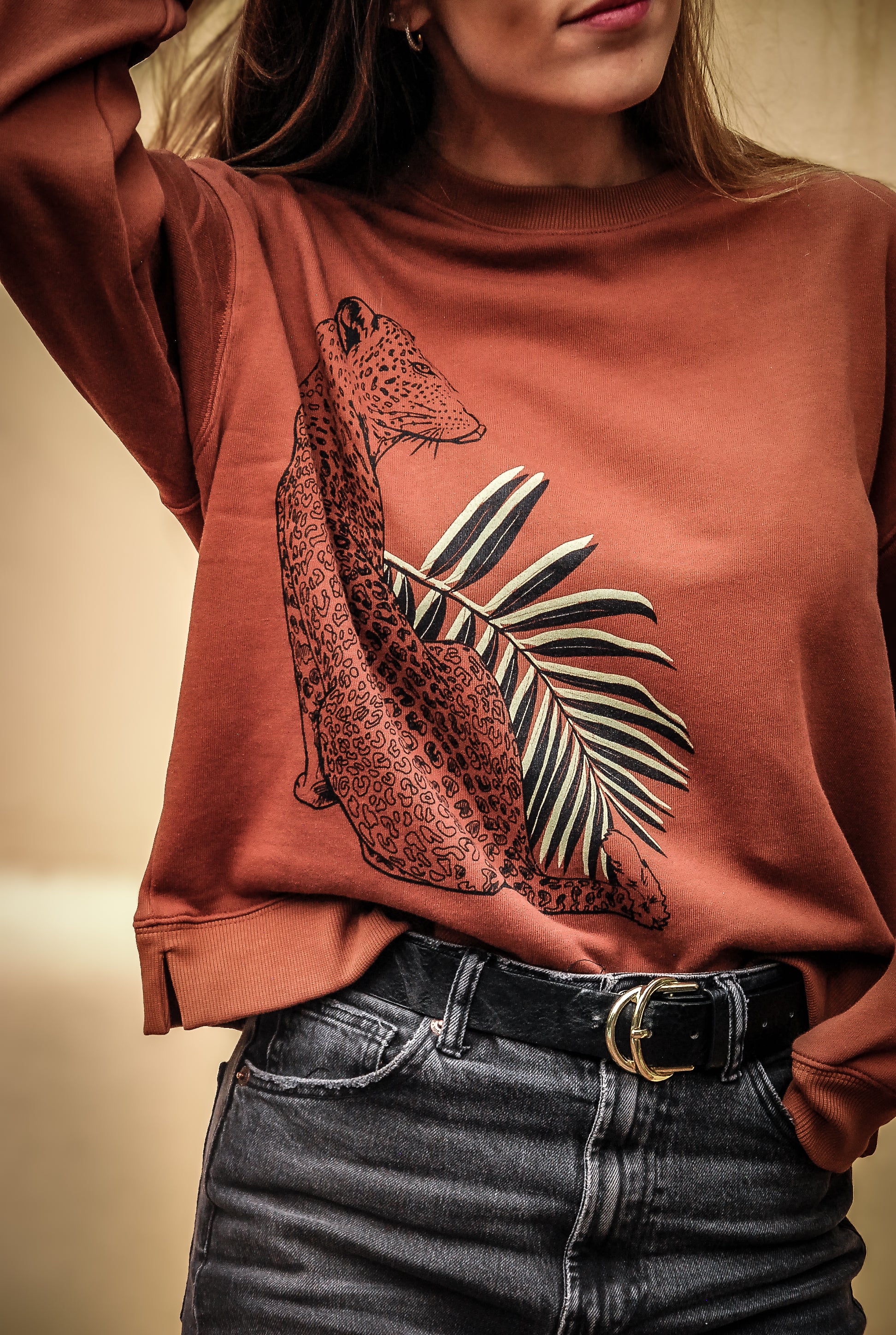 El tono ladrillo/caramelo aporta calidez a cualquier look, mientras que el estampado de leopardo añade un detalle llamativo. Combina perfectamente con jeans, joggers o faldas casuales, adaptándose a cualquier ocasión.